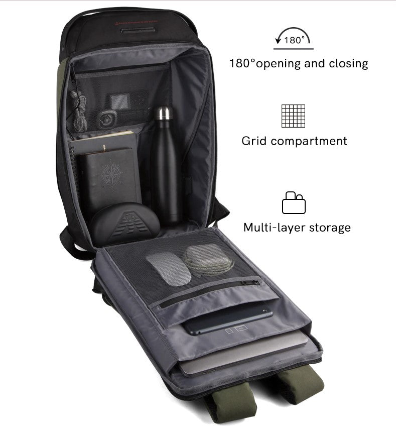 Освен това тази раница е оборудвана стандартно с USB зареждане и водоустойчивост. Вътрешните джобове са много добре организирани, така че можете да подредите хубаво вещите си а материалите на изработка са от най-високо качество. Подходяща е за лаптоп с размер до 15.6 инча.
