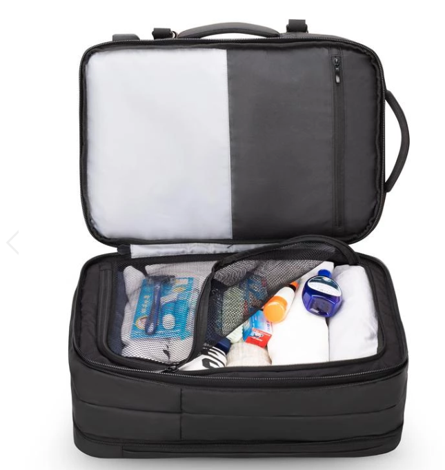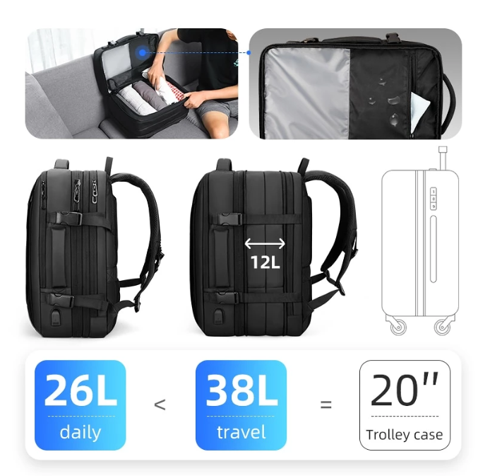 Друга чудесна функционалност е възможността за разширяване, когато имаш нужда от допълнително пространство за пътуване или екскурзия. Раницата е проектирана така, че може да се разтяга и да стане голяма, колкото малък куфар, а иначе казано до 38 литра побираемост. Достатъчно място, което да побере дрехите за 2-5 дни пътуване, а също така ще има достатъчно място за целия ти комплект козметични принадлежности.