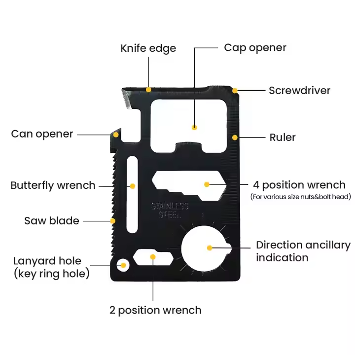 Изработен от неръждаема стомана 304L, картата е устойчива на корозия, удари и високи температури. Това я прави подходяща както за ежедневна употреба, така и за екстремни ситуации.